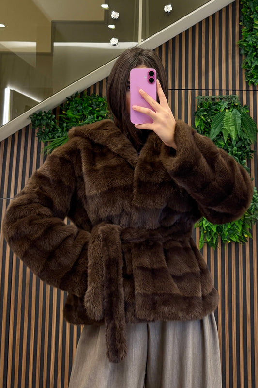 Giacca in eco-pelliccia con cappuccio – Marrone Caffè