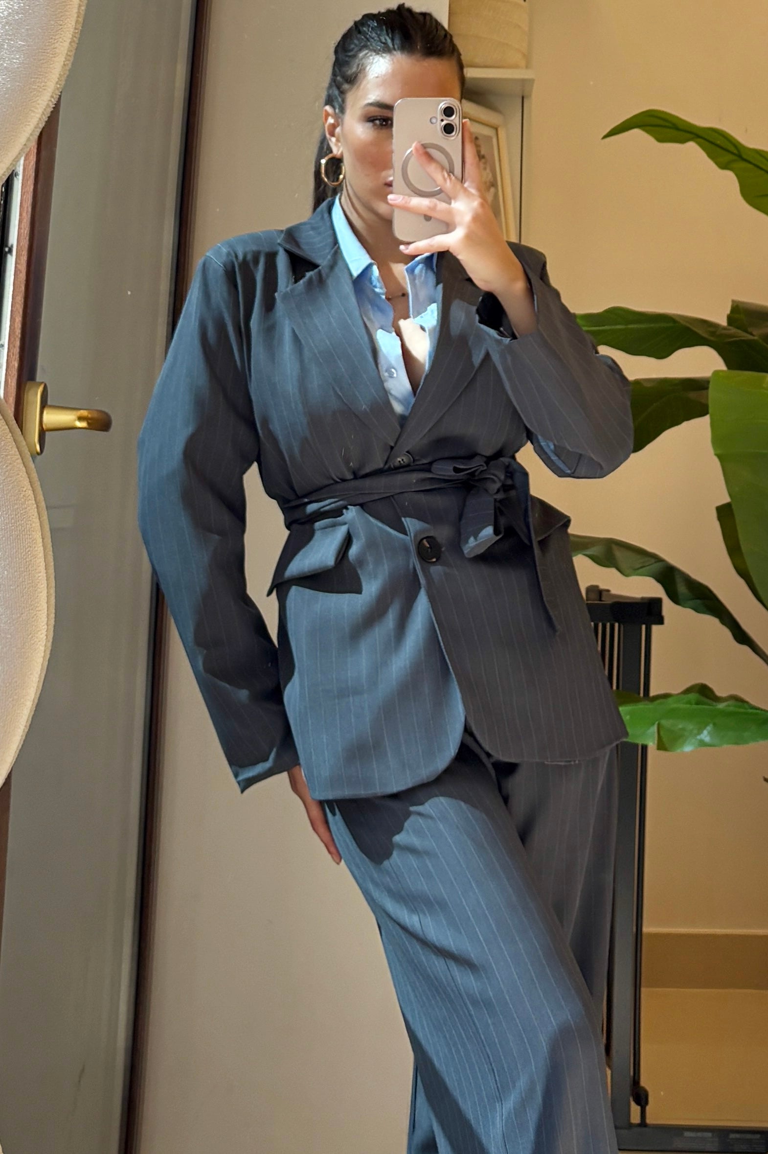 - Giacca con revers classico, chiusura a bottone e cintura coordinata
