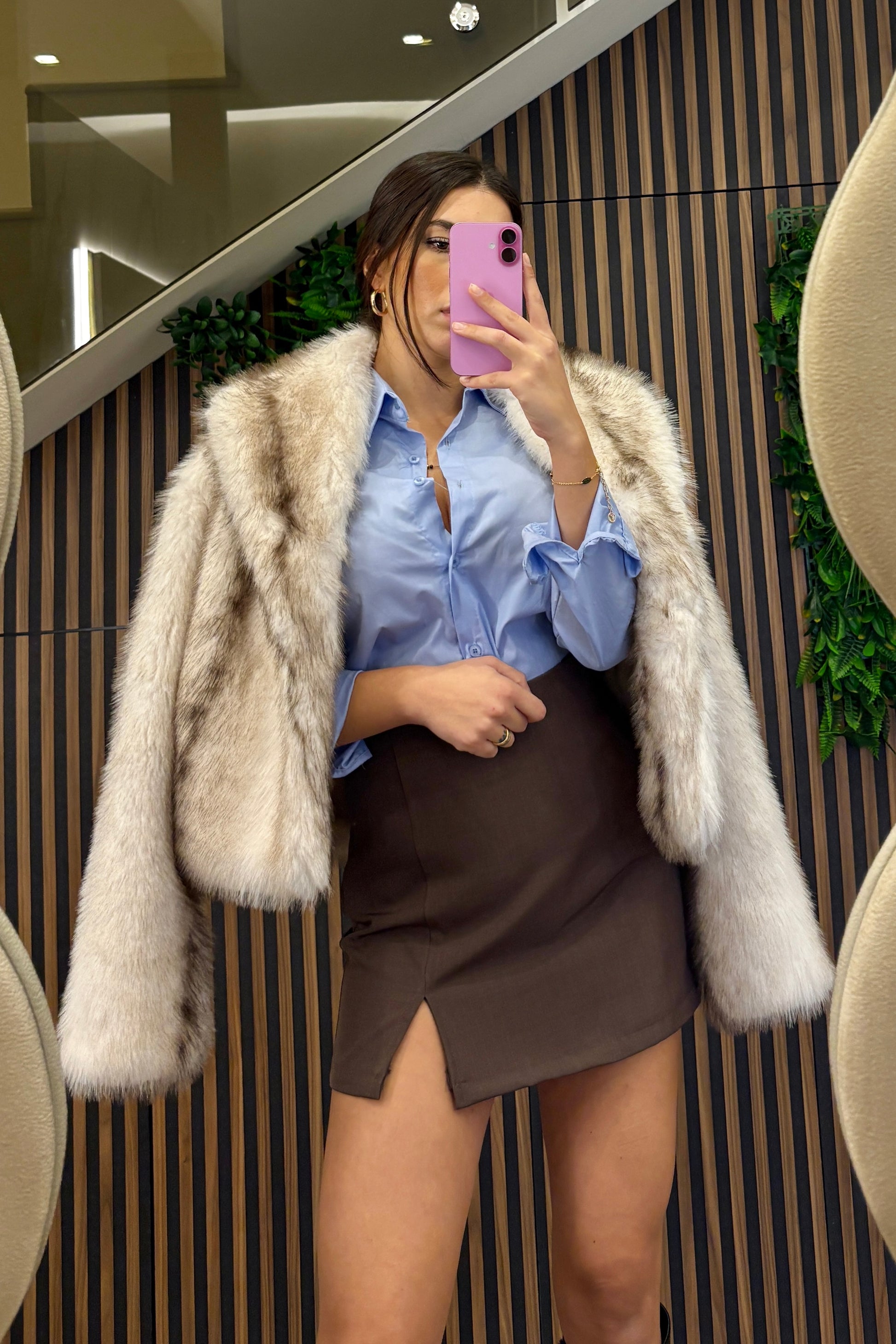 Giacca in eco-pelliccia con cappuccio – Beige Champagne